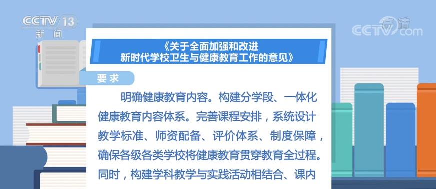 《意见》要求,明确健康教育内容。构建分学段、一体化健康教育内容体系。完善课程安排,系统设计教学标准、师资配备、评价体系、制度保障,确保各级各类学校将健康教育贯穿教育全过程。同时,构建学科教学与实践活动相结合、课内教育与课外教育相结合、经常性宣传教育与集中式宣传教育相结合的健康教育模式。鼓励开展健康知识竞赛、健康技能展示等,每年举办全国学校健康教育成果展示。