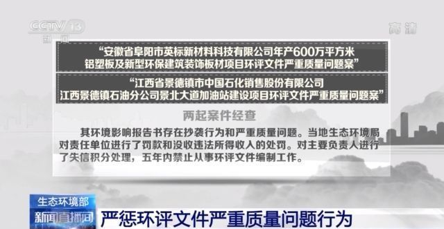 “安徽省阜阳市英标新材料科技有限公司年产600万平方米铝塑板及新型环保建筑装饰板材项目环评文件严重质量问题案”“江西省景德镇市中国石化销售股份有限公司江西景德镇石油分公司景北大道加油站建设项目环评文件严重质量问题案”两起案件经查,其环境影响报告书存在抄袭行为和严重质量问题。当地生态环境局对责任单位进行了罚款和没收违法所得收入的处罚。对主要负责人进行了失信积分处理,五年内禁止从事环评文件编制工作。