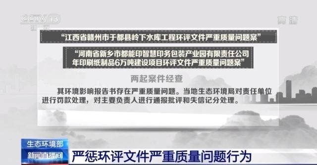 “江西省赣州市于都县岭下水库工程环评文件严重质量问题案”“河南省新乡市都能印智慧印务包装产业园有限责任公司年印刷纸制品6万吨建设项目环评文件严重质量问题案”两起案件经查,其环境影响报告书存在严重质量问题。当地生态环境局对责任单位进行罚款处理,对主要负责人进行通报批评和失信记分处理。