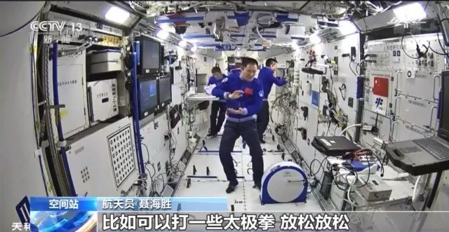 航天员 汤洪波:我们的航天专家,为我们研制并携带了一套的锻炼设备。这里有太空跑台、太空自行车、太空压力器、握力器以及呼吸训练装备。经过这一系列的锻炼以后,我们还要进行一些放松的动作,比如可以打一些太极拳,放松放松。