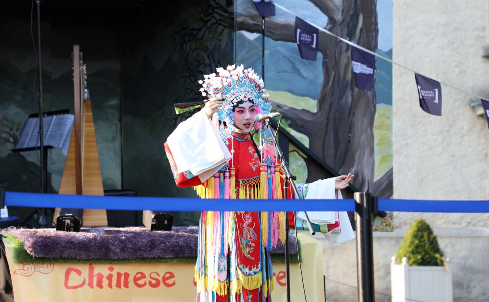 8月28日,一名女子在爱尔兰都柏林的爱尔兰现代艺术博物馆表演京剧。(新华社发)