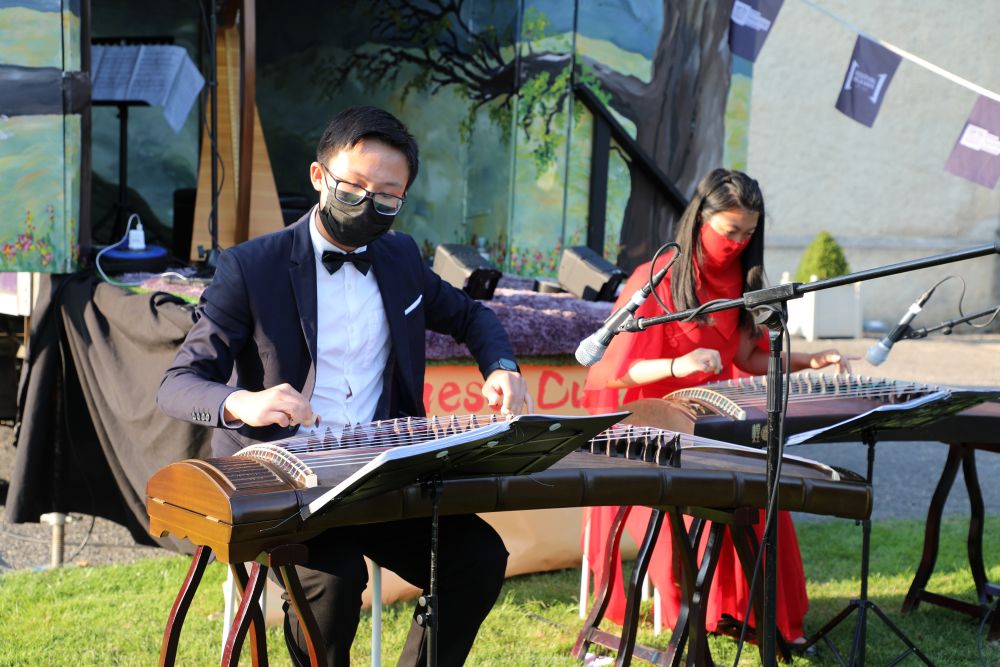 8月28日,两名表演者在爱尔兰都柏林的爱尔兰现代艺术博物馆弹奏古筝。(新华社发)