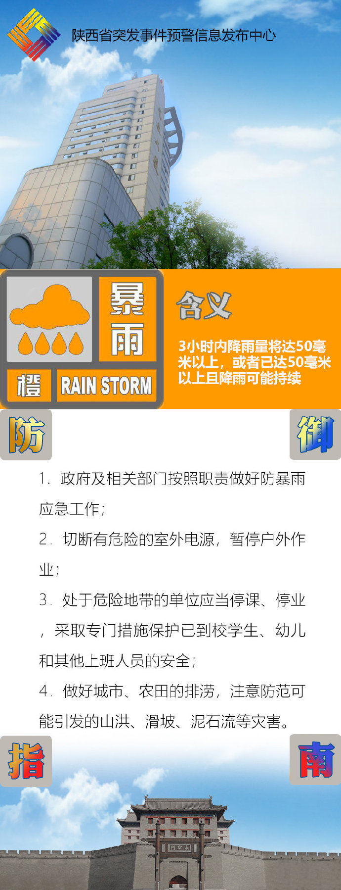 陕西省气象台2021年9月3日17时37分发布暴雨橙色预警信号:过去6小时延安市中北部部分县区降水量已达50毫米以上,预计下述地区未来3小时内降水仍将持续,小时雨强可达10毫米左右:延安市宝塔区、延川县、安塞区、志丹县、富县、洛川县、宜川县、黄龙县、黄陵县、延长县、甘泉县。另下述地区未来3小时有短时暴雨,小时雨强10毫米以上:铜川市王益区、印台区、耀州区、宜君县,宝鸡市眉县、凤县、太白县、渭滨区、金台区、陈仓区、凤翔区、岐山县、扶风县、陇县、千阳县、麟游县,杨凌杨陵区,咸阳市泾阳县、乾县、礼泉县、旬邑县、淳化县、武功县、永寿县、彬州市、长武县,汉中市留坝县,请注意防范。