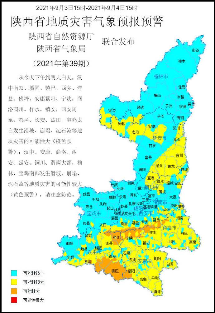 陕西省自然资源厅与陕西省气象局联合发布地质灾害气象预报预警:预计2021年9月3日15时至2021年9月4日15时,汉中南郑、城固、镇巴、西乡、洋县、佛坪,安康紫阳、宁陕,商洛商州、柞水、镇安,西安周至、鄠邑、长安、蓝田,宝鸡太白发生滑坡、崩塌、泥石流等地质灾害的可能性大(橙色预警);汉中、安康、商洛、西安、延安、铜川、渭南大部,榆林、宝鸡南部发生滑坡、崩塌、泥石流等地质灾害的可能性较大(黄色预警),请注意防范。(总台记者 杨雨桐 耿晓斌)
