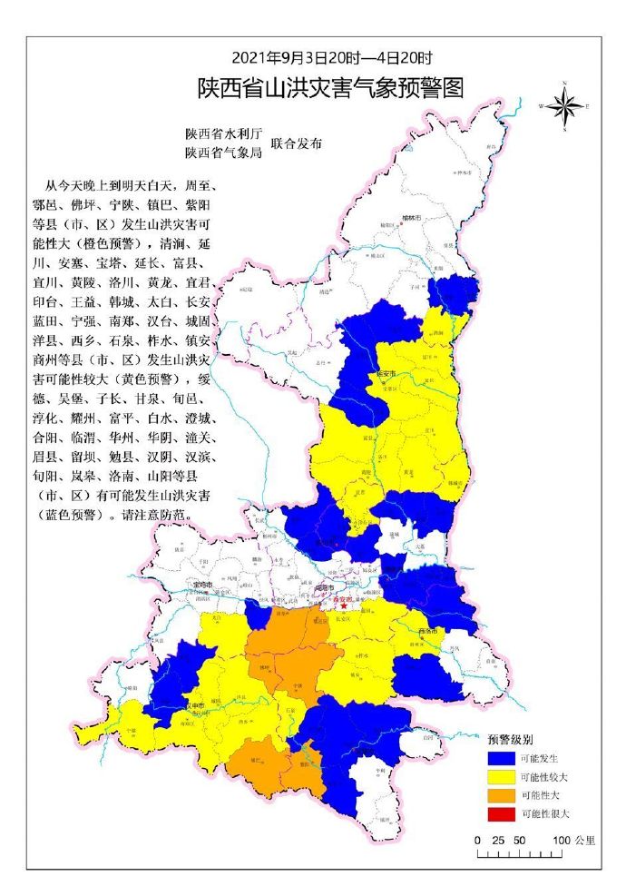 陕西省水利厅与陕西省气象局联合发布山洪灾害气象预警:预计2021年9月3日20时至4日20时,周至、鄠邑、佛坪、宁陕、镇巴、紫阳等县(市、区)发生山洪灾害可能性大(橙色预警),清涧、延川、安塞、宝塔、延长、富县、宜川、黄陵、洛川、黄龙、宜君、印台、王益、韩城、太白、长安、蓝田、宁强、南郑、汉台、城固、洋县、西乡、石泉、柞水、镇安、商州等县(市、区)发生山洪灾害可能性较大(黄色预警),绥德、吴堡、子长、甘泉、旬邑、淳化、耀州、富平、白水、澄城、合阳、临渭、华州、华阴、潼关、眉县、留坝、勉县、汉阴、汉滨、旬阳、岚皋、洛南、山阳等县(市、区)有可能发生山洪灾害(蓝色预警)。请注意防范。