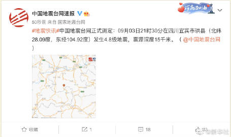 #地震快讯#中国地震台网正式测定:09月03日21时30分在四川宜宾市珙县(北纬