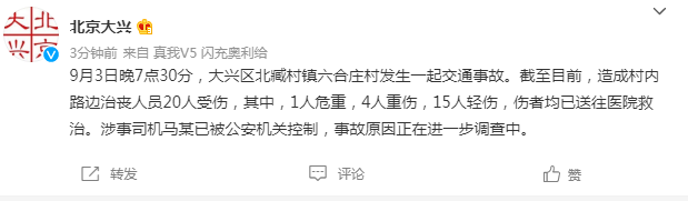 据“北京大兴”微博消息,9月3日晚7点30分,大兴区北臧村镇六合庄村发生一起交通事故。截至目前,造成村内路边治丧人员20人受伤,其中,1人危重,4人重伤,15人轻伤,伤者均已送往医院救治。涉事司机马某已被公安机关控制,事故原因正在进一步调查中。