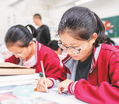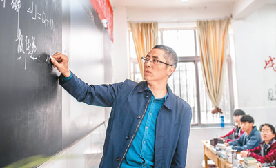 宁蒗宁海民族中学海安4班的班主任谢友军在教室里上课。来支教的海安老师要适应当地的高原气候和生活习惯。谢友军刚到宁蒗时,因为海拔高,爬坡喘不过气,现在可以在操场跑两圈了。