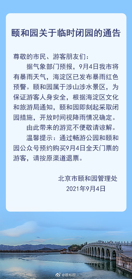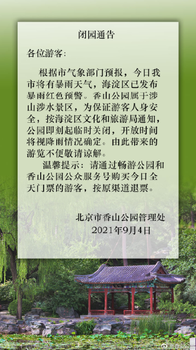 根据北京市气象部门预报,今日(4日)北京市将有暴雨天气。颐和园、香山公园和北京植物园属于涉山涉水景区,为了保证游客人身安全,即刻起临时关闭,开放时间将视雨晴而定。