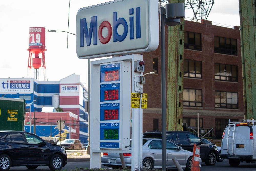 5月12日,美国纽约布鲁克林区一家美孚加油站的电子屏显示油品价格。(新华社发,郭克摄)