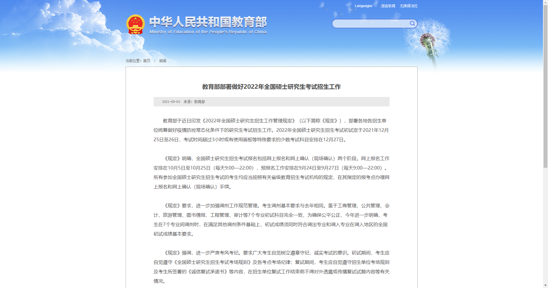 央视网消息:据教育部网站消息,教育部于近日印发《2022年全国硕士研究生招生工作管理规定》(以下简称《规定》),部署各地各招生单位统筹做好疫情防控常态化条件下的研究生考试招生工作。2022年全国硕士研究生招生考试初试定于2021年12月25日至26日,考试时间超过3小时或有使用画板等特殊要求的少数考试科目安排在12月27日。