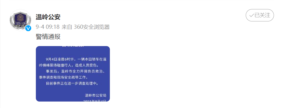 央视网消息:9月4日上午,浙江温岭市公安局官方微博就菜场撞人情况通报最新警情。通报如下: