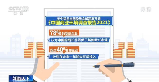 美中贸易全国委员会最新发布的《中国商业环境调查报告2021》显示,78%的受访企业认为中国的增长前景优于其他新兴市场,超过40%的企业计划在未来一年加大在华投入。
