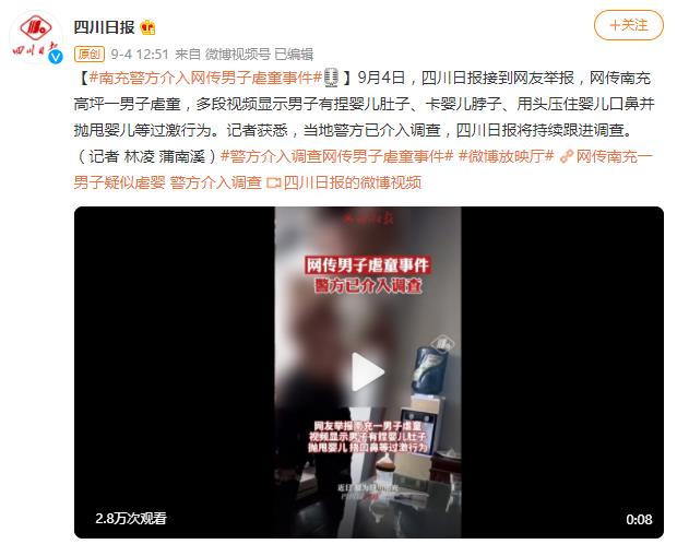 央视网消息:据四川日报微博消息,9月4日,四川日报接到网友举报,网传南充高坪一男子虐童,多段视频显示男子有捏婴儿肚子、卡婴儿脖子、用头压住婴儿口鼻并抛甩婴儿等过激行为。记者获悉,当地警方已介入调查。