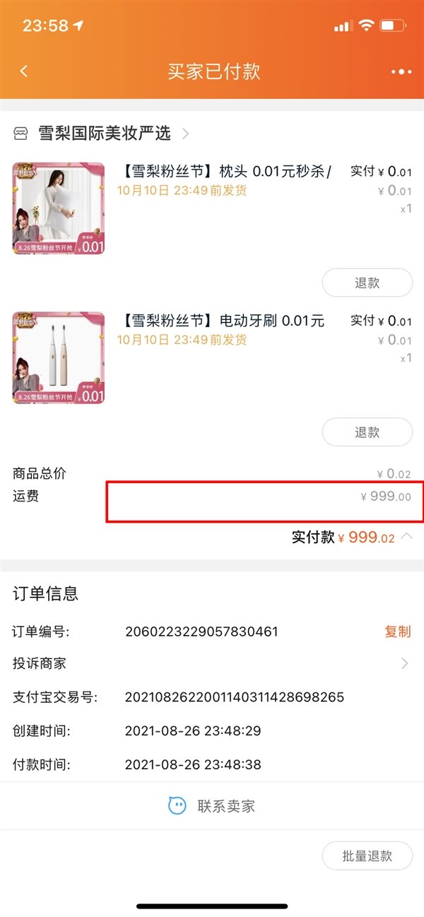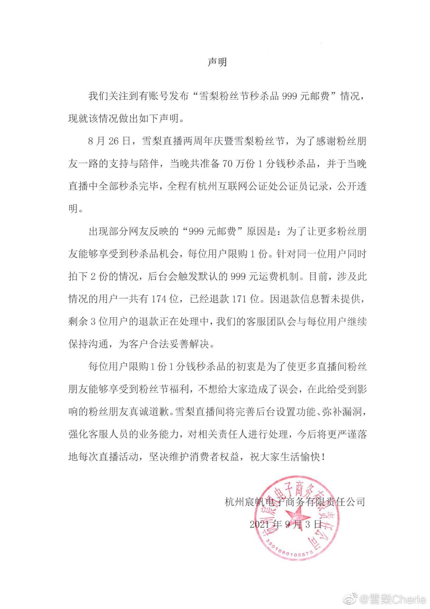 央视网消息:9月3日,知名主播雪梨通过认证微博就粉丝节当天1分钱秒杀却要999元运费的情况作出回应:出现“999元邮费”原因是,直播当晚共准备了70万份1分钱秒杀品,每位用户限购1份。针对同一位用户同时拍下2份的情况,后台会触发默认的999元运费机制。