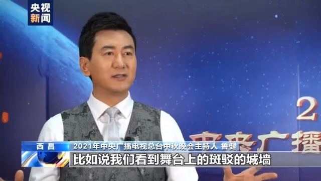 2021年中央广播电视总台中秋晚会主持人 鲁健:比如说我们看到舞台上斑驳的城墙,和当地特有的黄葛树,特别有历史感和沧桑感。