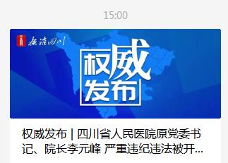 央视网消息:据“廉洁四川”微信公号消息,日前,经四川省委批准,省纪委监委对四川省人民医院原党委书记、院长李元峰严重违纪违法问题进行了立案审查调查。