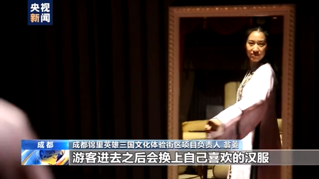 成都锦里英雄三国文化体验街区项目负责人 翁菱:我们整个街区有一个场景体验,还原三国文化的一个消费场景汉宴。游客进去之后会换上自己喜欢的汉服,然后席地而坐分餐制,过程当中我们会安排一些有这种汉朝特色的歌舞表演。