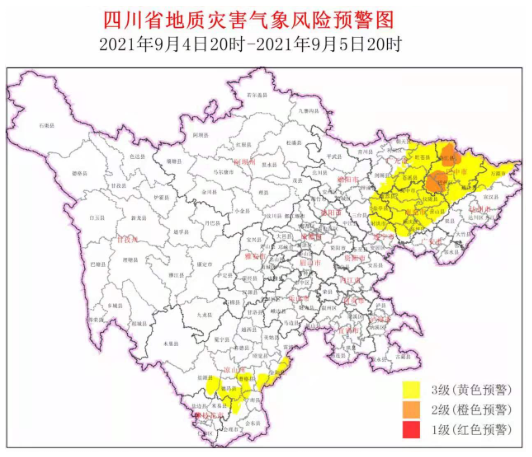 四川省地质灾害指挥部办公室发布消息,今天(9月4日)20时—9月5日20时,巴中市4个县(区) 进入地质灾害气象风险2级橙色预警范围,8市(州)33个县(市、区)进入3级黄色预警范围。