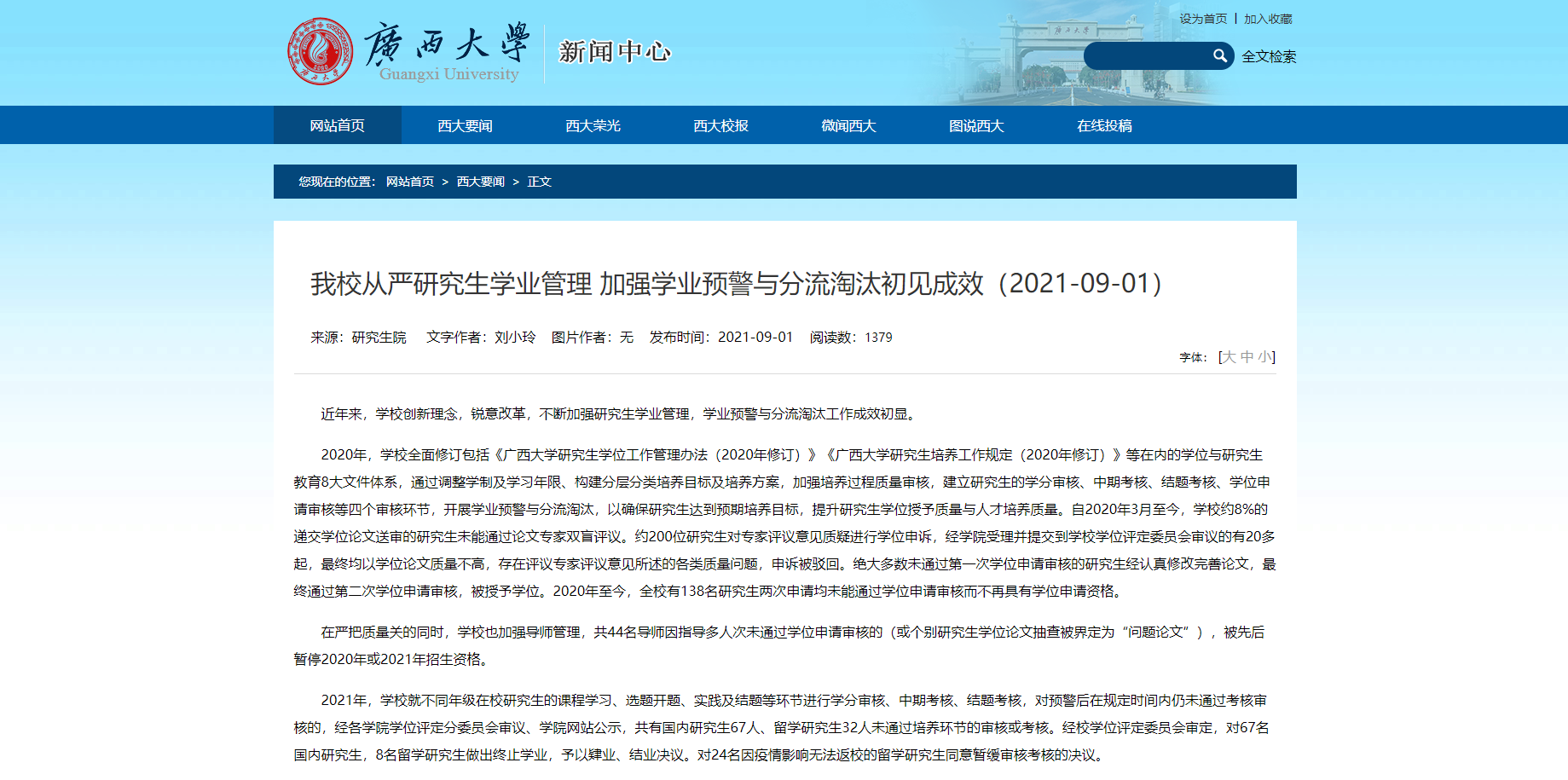 央视网消息:据广西大学网站消息,近年来,广西大学不断加强研究生学业管理,学业预警与分流淘汰工作成效初显。