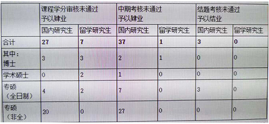 2021年,学校就不同年级在校研究生的课程学习、选题开题、实践及结题等环节进行学分审核、中期考核、结题考核,对预警后在规定时间内仍未通过考核审核的,经各学院学位评定分委员会审议、学院网站公示,共有国内研究生67人、留学研究生32人未通过培养环节的审核或考核。经校学位评定委员会审定,对67名国内研究生,8名留学研究生做出终止学业,予以肄业、结业决议。对24名因疫情影响无法返校的留学研究生同意暂缓审核考核的决议。