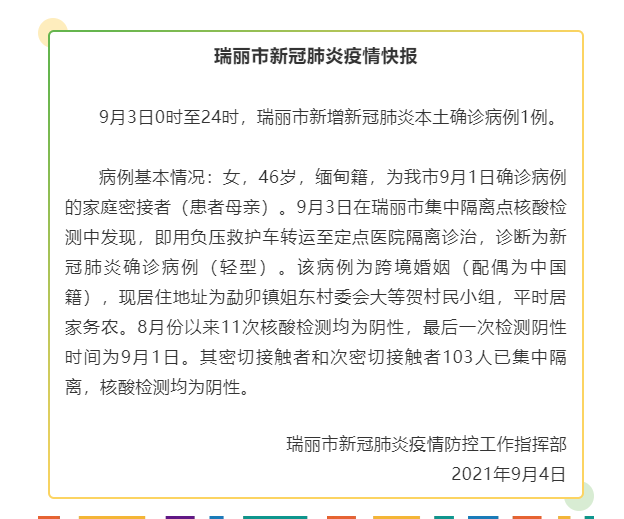 瑞丽市新冠肺炎疫情防控工作指挥部发布疫情快报,通报确诊病例的基本情况:女,46岁,缅甸籍,为瑞丽市9月1日确诊病例的家庭密接者(患者母亲)。9月3日在瑞丽市集中隔离点核酸检测中发现,即用负压救护车转运至定点医院隔离诊治,诊断为新冠肺炎确诊病例(轻型)。该病例为跨境婚姻(配偶为中国籍),现居住地址为勐卯镇姐东村委会大等贺村民小组,平时居家务农。8月份以来11次核酸检测均为阴性,最后一次检测阴性时间为9月1日。其密切接触者和次密切接触者103人已集中隔离,核酸检测均为阴性。