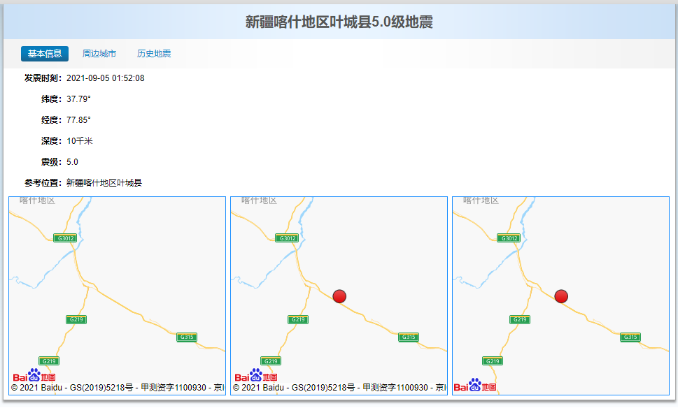9月5日1时52分在新疆喀什地区叶城县(北纬37.79度,东经77.85度)发生5.0级地震,震源深度10千米。