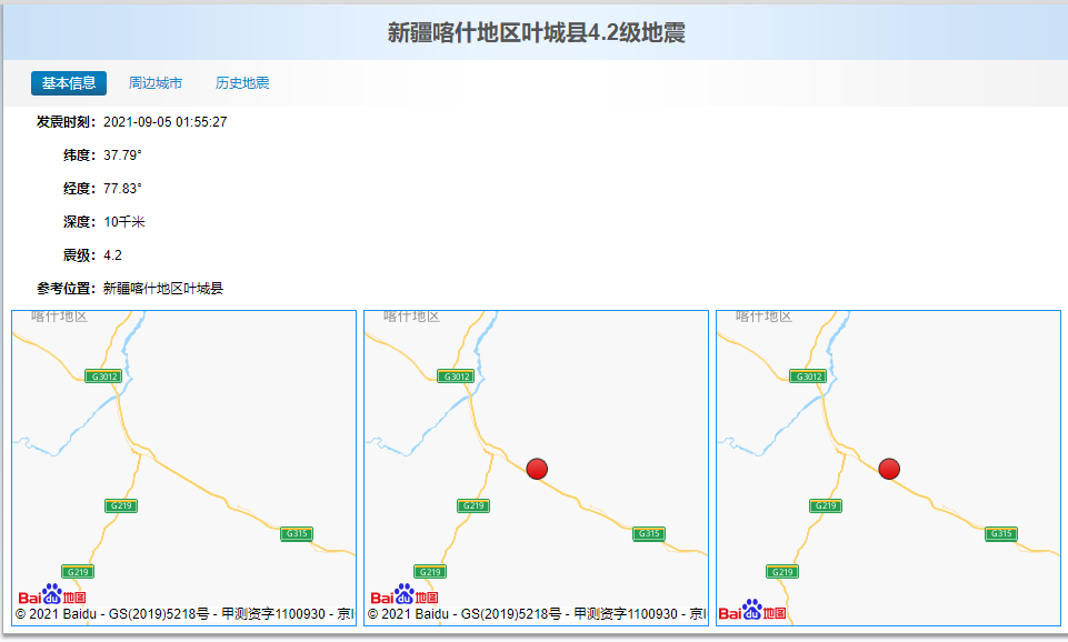央视网消息:据中国地震台网消息,9月5日1时55分在新疆喀什地区叶城县(北纬37.79度,东经77.83度)发生4.2级地震,震源深度10千米。