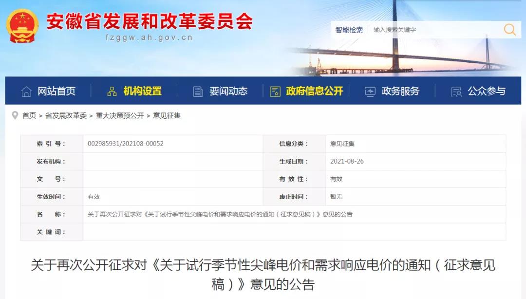 央视网消息:据“安徽发布”微信公众号消息,为落实国家“碳达峰、碳中和”战略目标,运用价格杠杆引导电力用户积极参与电力需求响应,安徽省发展改革委、省能源局出台《关于试行季节性尖峰电价和需求响应补偿电价的通知(征求意见稿)》,目前该方案再一次向社会公开征求意见。