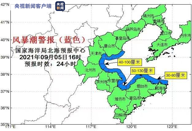 受气旋影响,预计9月5日傍晚至6日下午,山东半岛北部、莱州湾和渤海湾沿岸将分别出现30-80cm、50-130cm和40-100cm的风暴增水。滨州港、黄骅、塘沽和曹妃甸验潮站将出现达到当地蓝色警戒潮位的高潮位。山东省滨州市、河北省沧州市和唐山市、天津市预警级别为蓝色。