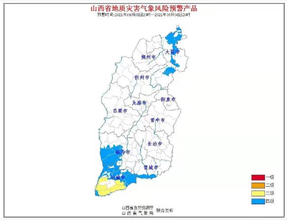 今天(9月5日)17时22分,山西省自然资源厅、山西省气象局联合发布2021年9月5日20时至6日20时地质灾害预警:
