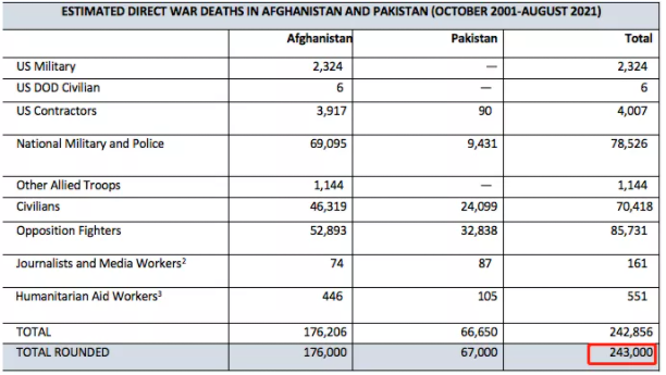 布朗大学的这项研究还估计阿富汗安全部队的损失为69000人。