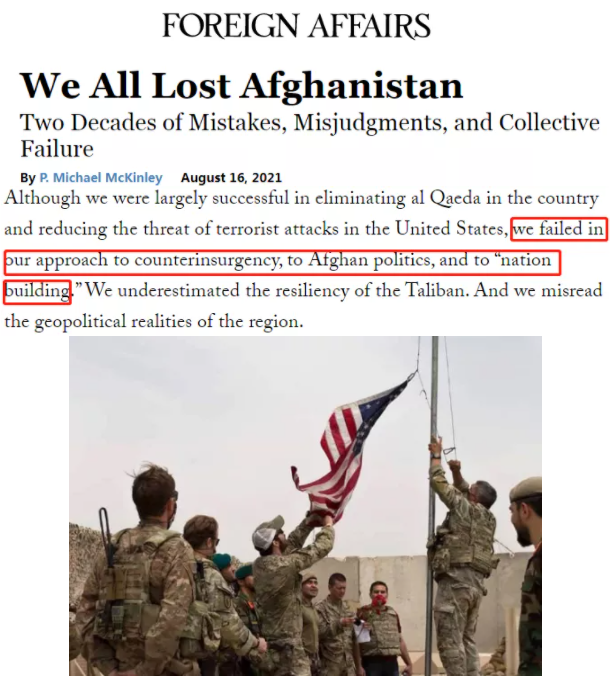 美国前驻阿富汗大使迈克尔·麦金利在《外交事务》杂志上发表题为《我们在阿富汗的完败》一文,分析了美国政府20年来在阿富汗的错误、错判和集体失败,在应对阿国内反对派力量、国内政治以及“国家建设”方面的举措都失败了。