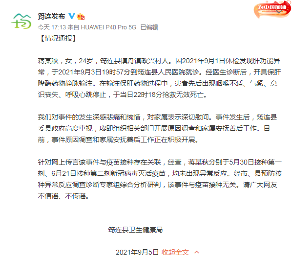 央视网消息:据@筠连发布消息,四川省宜宾市筠连县人民政府官方微博9月5日发布情况通报:蒋某秋,女,24岁,筠连县镇舟镇政兴村人。因2021年9月1日体检发现肝功能异常,于2021年9月3日19时57分到筠连县人民医院就诊。经医生诊断后,开具保肝降酶药物静脉输注。在输注保肝药物过程中,患者先后出现咽喉不适、气紧、意识丧失、呼吸心跳停止,于当日22时18分抢救无效死亡。