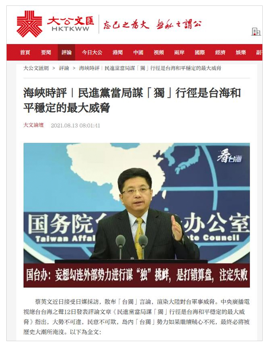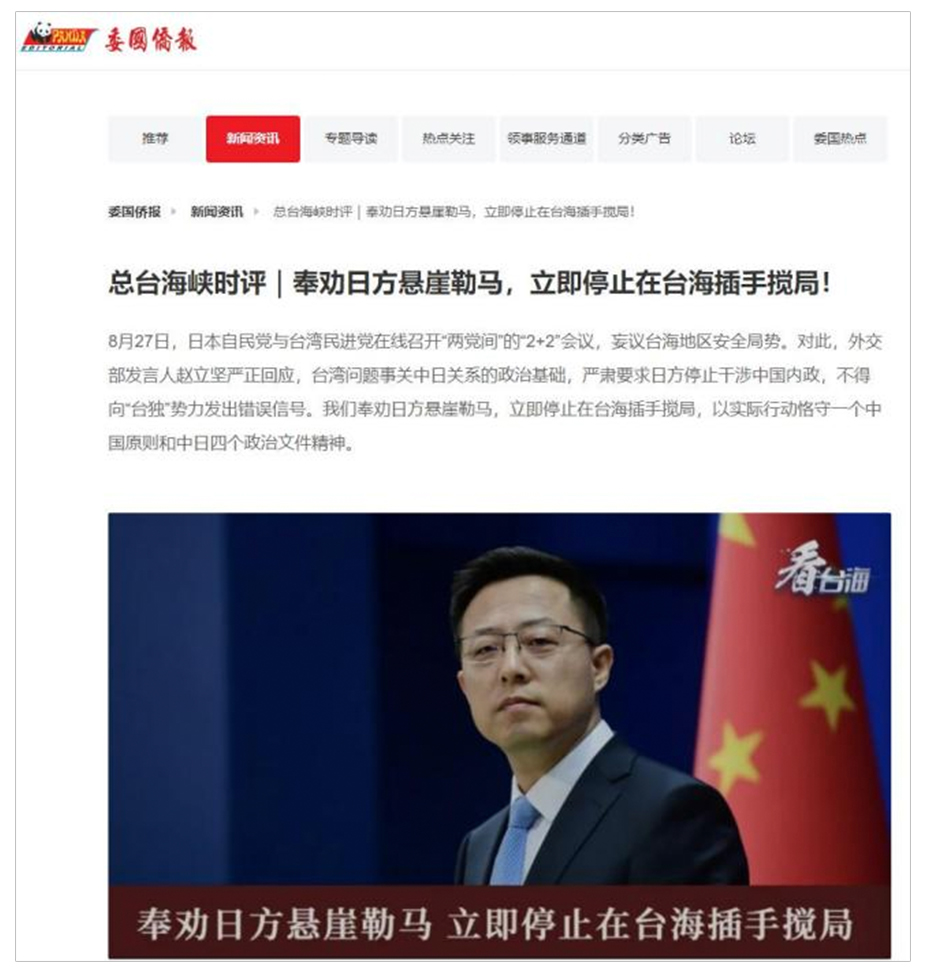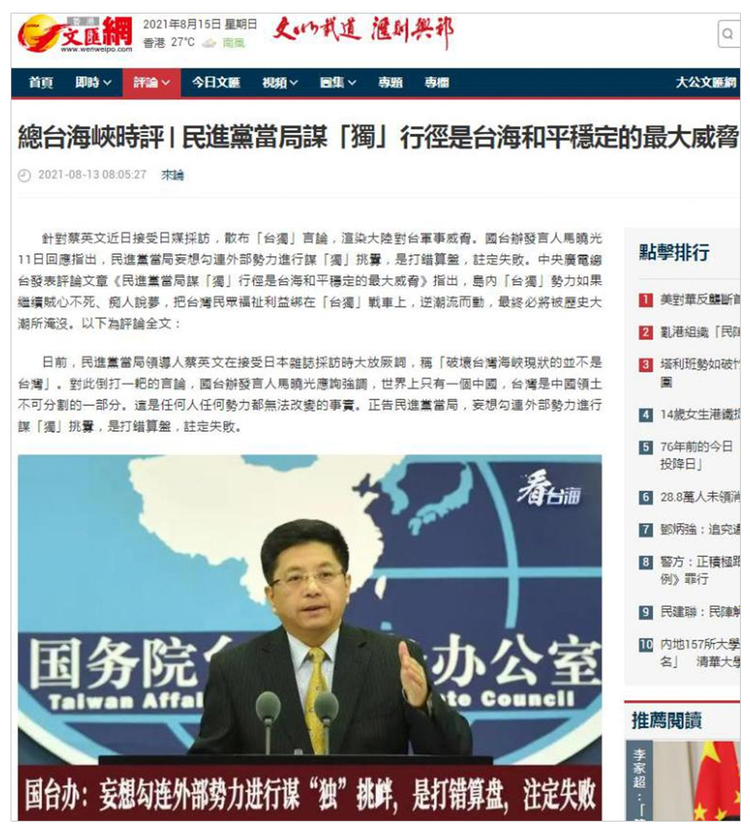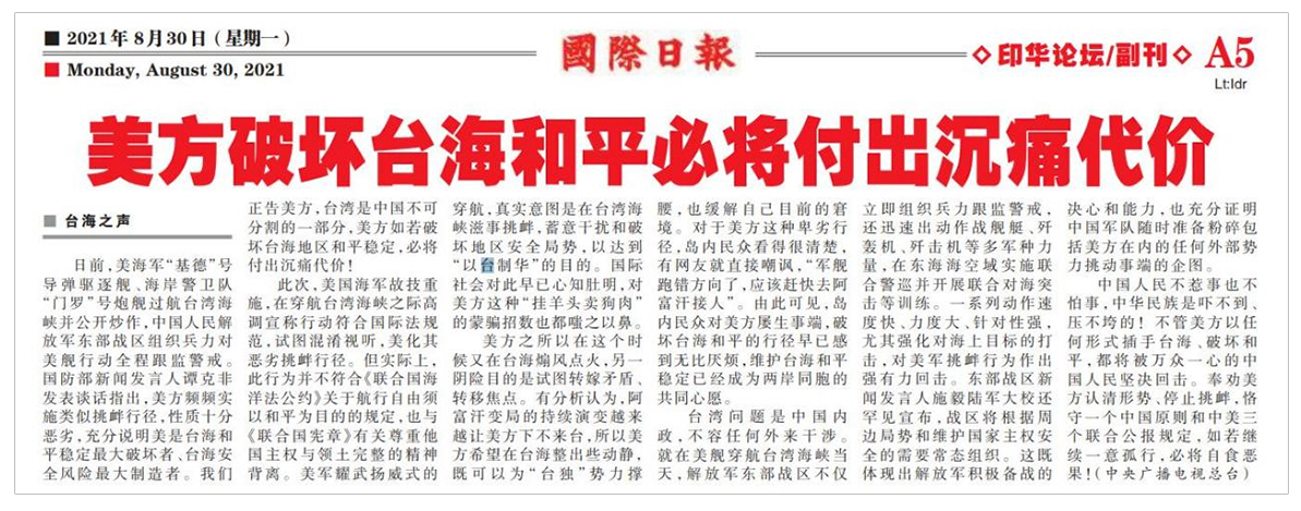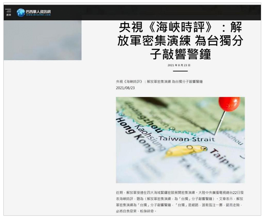 系列评论正告外部势力悬崖勒马,立即停止在台海插手搅局,强调中国国家强大、民族复兴、两岸统一的历史大势,任何人任何势力都无法阻挡。评论引发海外媒体高度关注。印尼《国际日报》、菲律宾《商报》、日本华商网、葡萄牙《葡新报》、匈牙利《联合报》、意大利《欧华联合时报》、欧洲华语广播电台、美国商业新闻网、巴西华人资讯网、委内瑞拉《委国侨报》、《非洲时报》、西非在线等媒体对评论广泛转载引用。