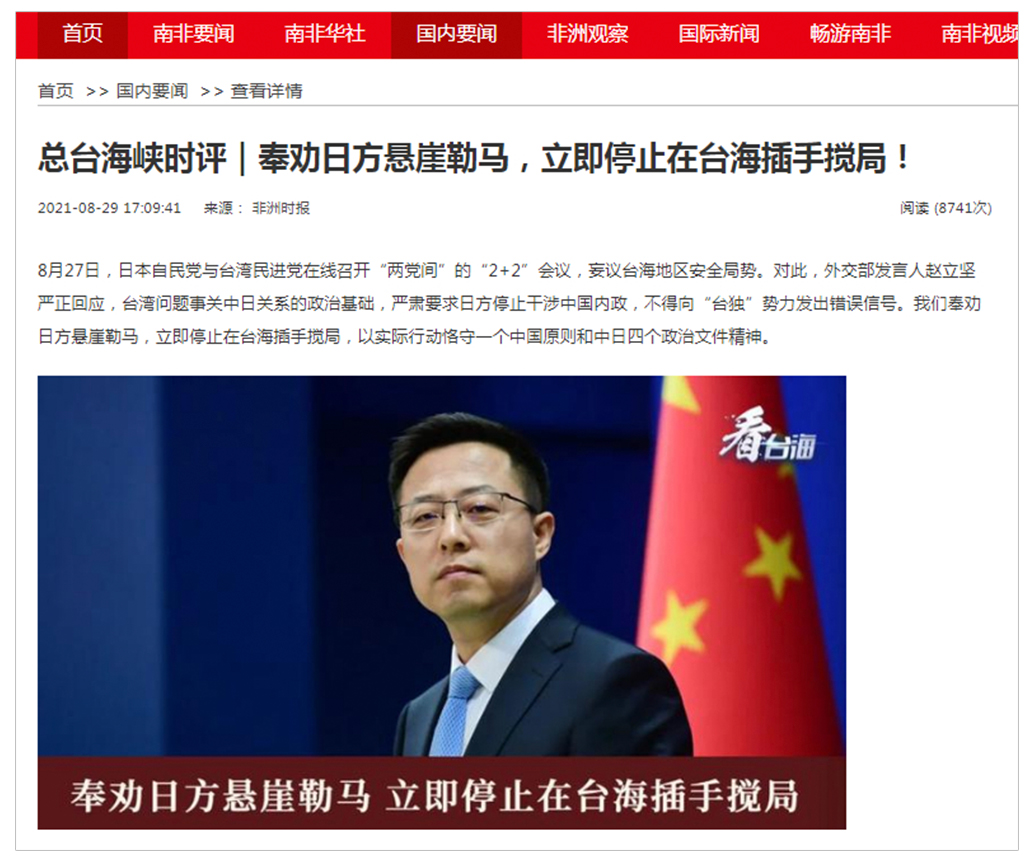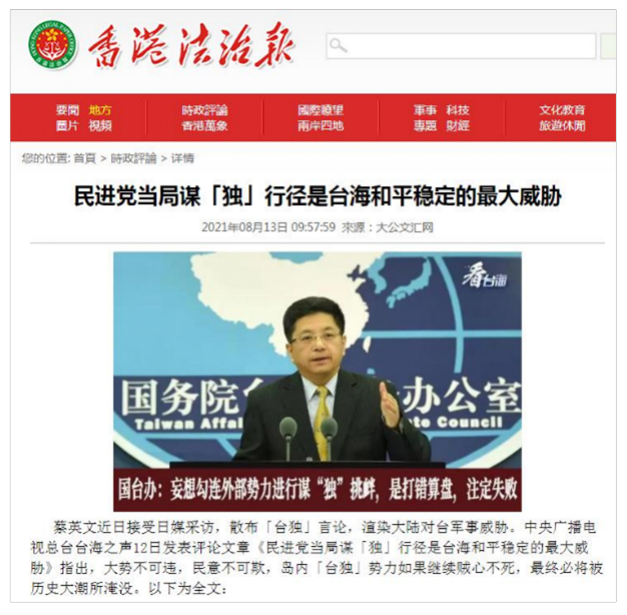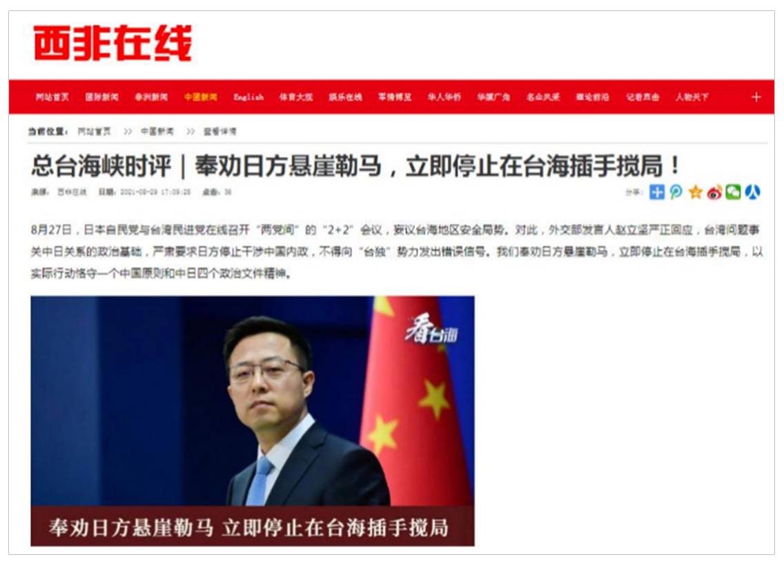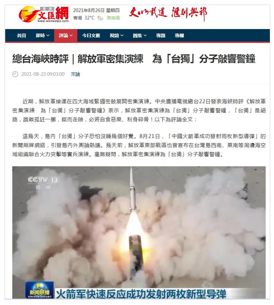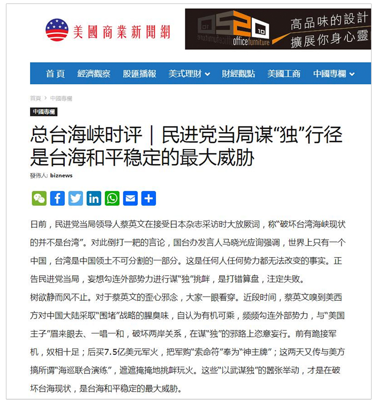 系列评论正告外部势力悬崖勒马,立即停止在台海插手搅局,强调中国国家强大、民族复兴、两岸统一的历史大势,任何人任何势力都无法阻挡。评论引发海外媒体高度关注。印尼《国际日报》、菲律宾《商报》、日本华商网、葡萄牙《葡新报》、匈牙利《联合报》、意大利《欧华联合时报》、欧洲华语广播电台、美国商业新闻网、巴西华人资讯网、委内瑞拉《委国侨报》、《非洲时报》、西非在线等媒体对评论广泛转载引用。