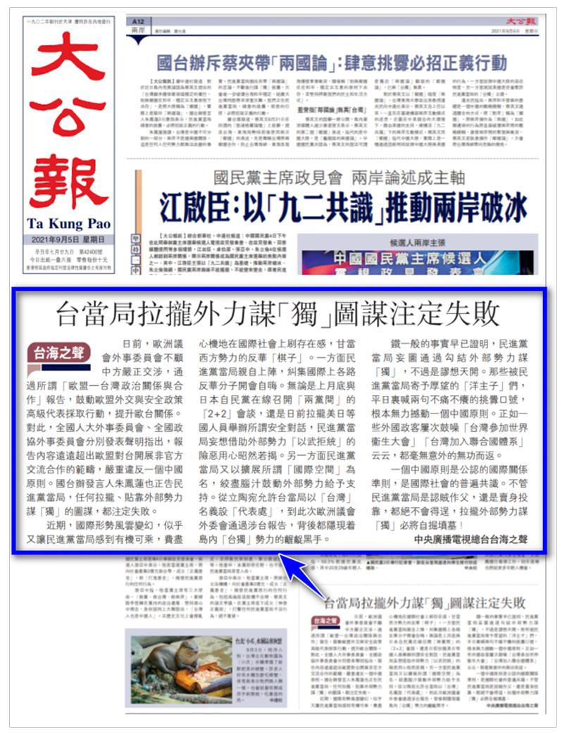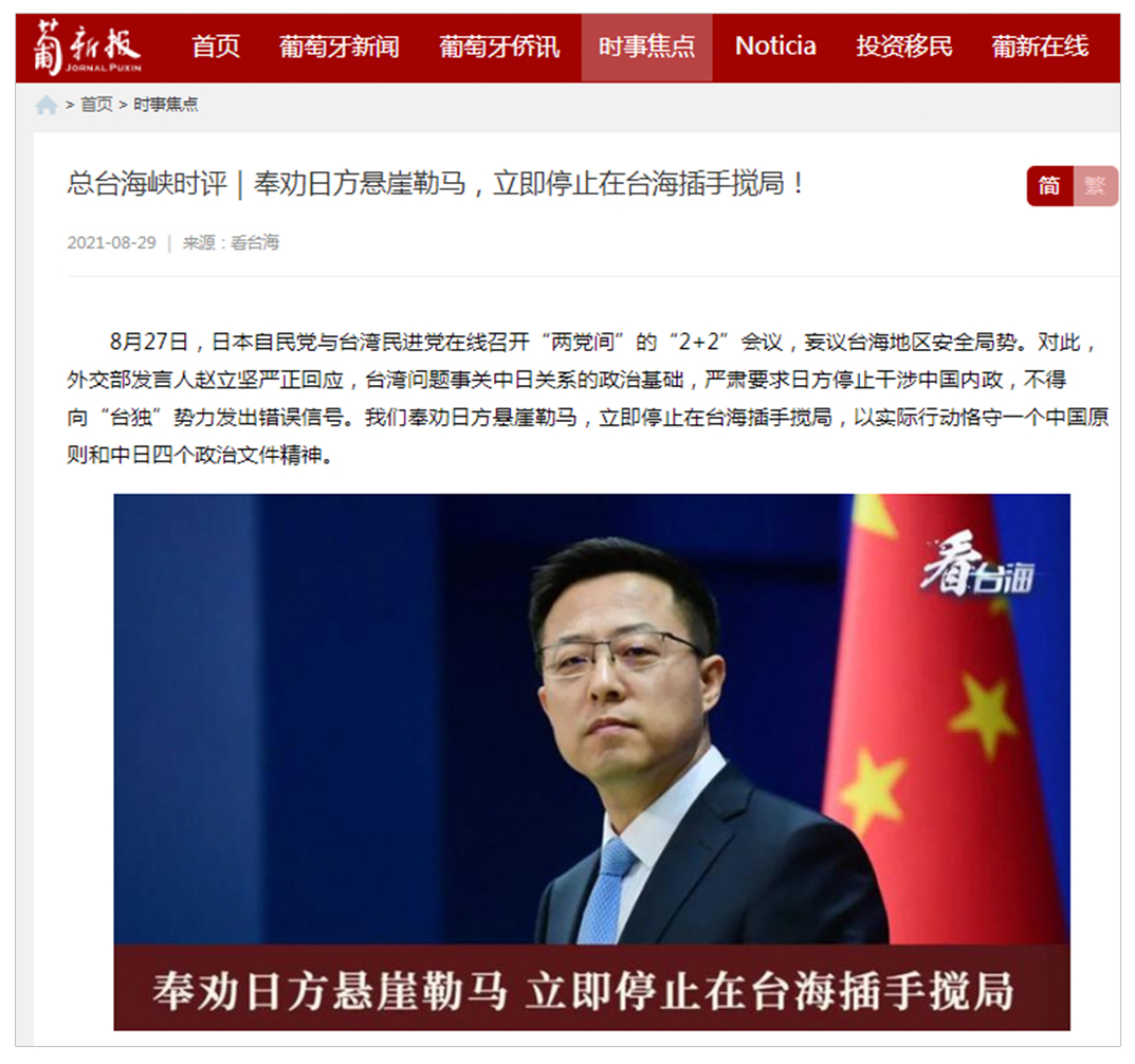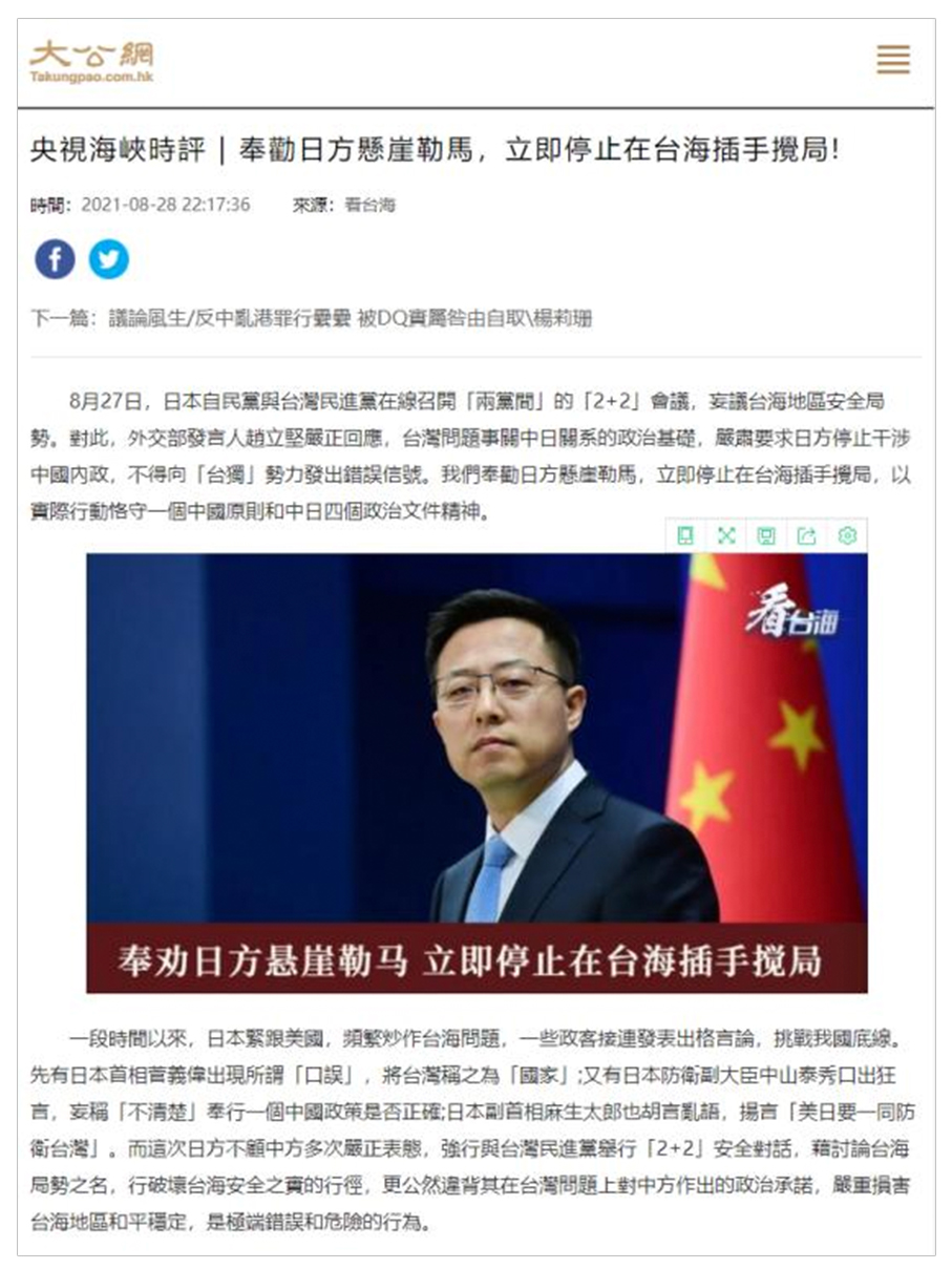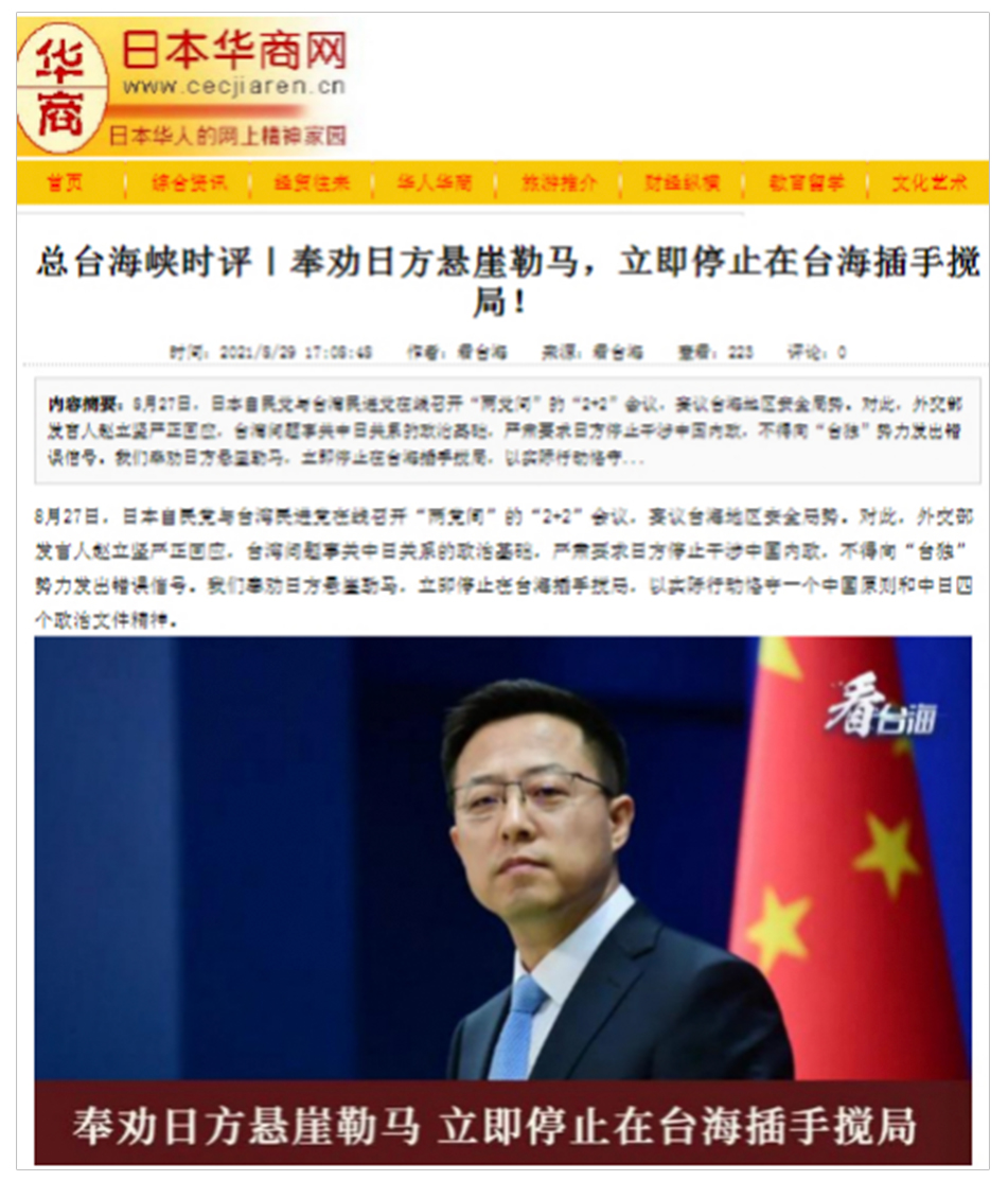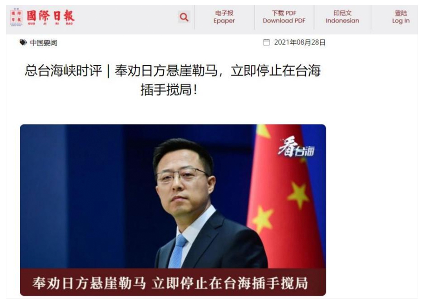 系列评论正告外部势力悬崖勒马,立即停止在台海插手搅局,强调中国国家强大、民族复兴、两岸统一的历史大势,任何人任何势力都无法阻挡。评论引发海外媒体高度关注。印尼《国际日报》、菲律宾《商报》、日本华商网、葡萄牙《葡新报》、匈牙利《联合报》、意大利《欧华联合时报》、欧洲华语广播电台、美国商业新闻网、巴西华人资讯网、委内瑞拉《委国侨报》、《非洲时报》、西非在线等媒体对评论广泛转载引用。