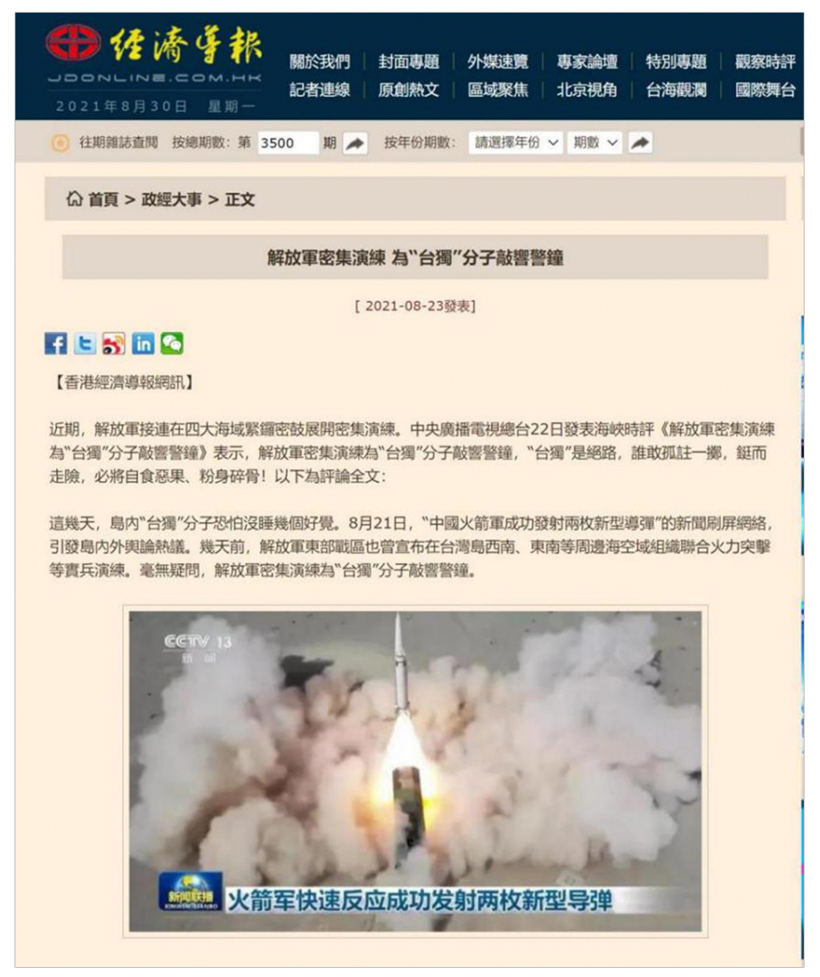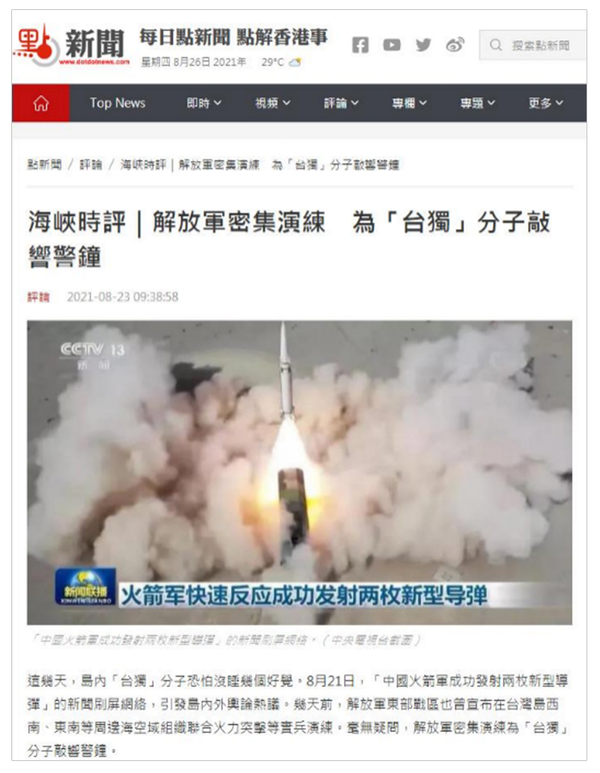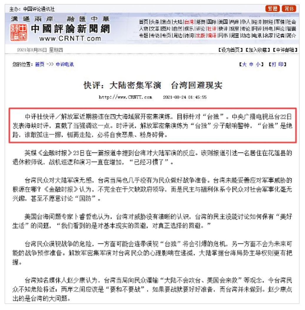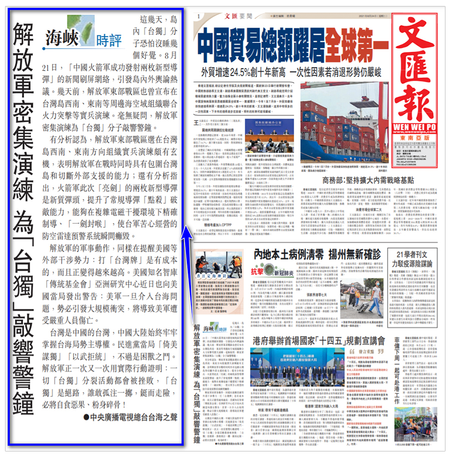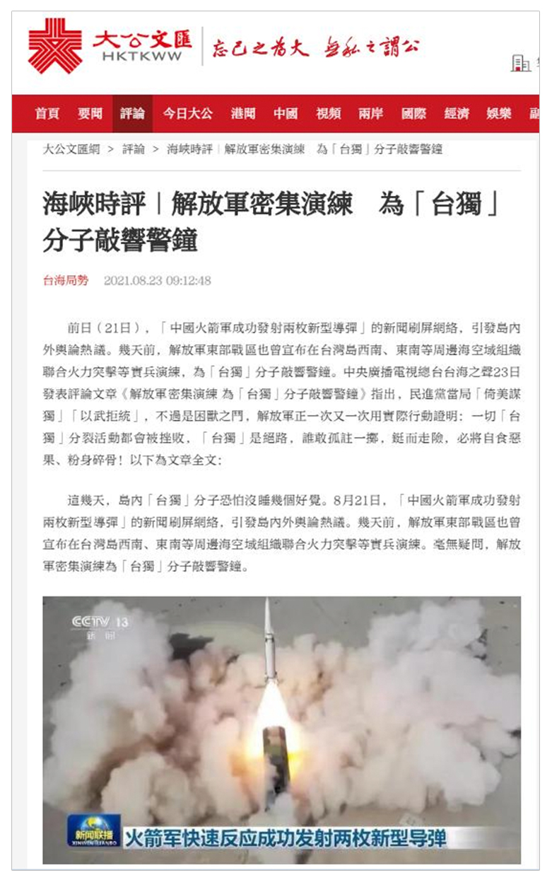 香港《文汇报》、《大公报》、星岛环球网、香港《经济导报》网、中国评论新闻网、点新闻、《香港法治报》、《巴士的报》,台湾中时新闻网、match生活网等港台媒体对系列评论进行转载或引用。其中,《解放军密集演练 为“台独”分子敲响警钟》《解放军枕戈待旦 坚决粉碎任何“台独”分裂图谋》的观点成为港台媒体关注的焦点。评论有力指出,民进党当局在谋“独”的邪路上恣意妄行,“倚美谋独”“以武拒统”,不过是困兽之斗。中国人民解放军枕戈待旦,将时刻保持高度戒备状态,坚决粉碎任何“台独”分裂图谋。“台独”势力胆敢铤而走险,必将自食恶果、粉身碎骨!