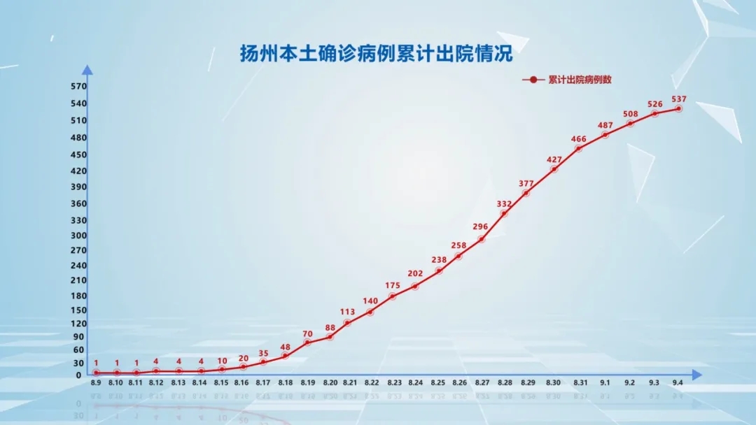 7月28日至今,扬州市累计报告本土确诊病例570例,出院537例。