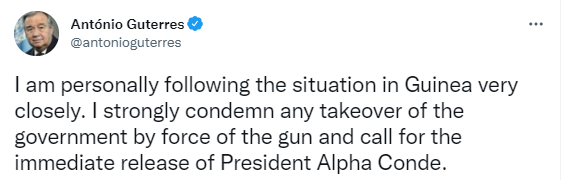 联合国秘书长古特雷斯在社交媒体中谴责几内亚特种部队夺取政权。他表示密切关注几内亚局势,强烈谴责任何以武力接管政府的行为,并呼吁立即释放几内亚总统孔戴。