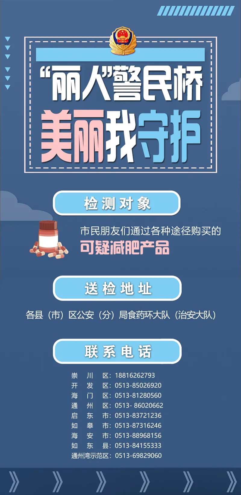 在党史学习教育“我为群众办实事”实践活动中,南通市公安局及时回应人民群众的现实期盼,决定开展“丽人警民桥”实践活动,在全市9个县级公安机关的食药环侦大队或治安大队设立免费受理检测点,帮助广大消费者免费检测减肥产品。受理时间为工作日的上午9点至下午5点。