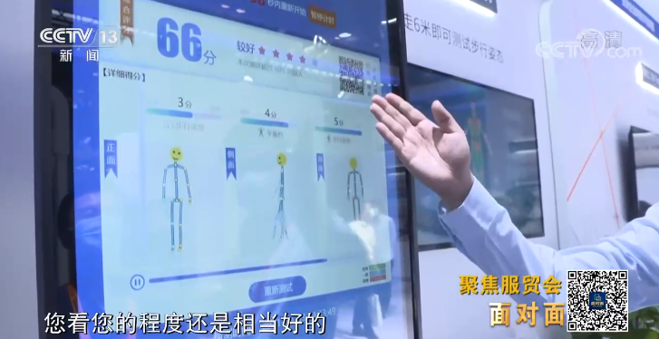 本届服贸会,70余家境内外知名企业将发布新技术、新成果和新服务。连续3届参加服贸会的世界500强企业NEC今年带来了他们最新的产品,活动能力检测一体机,测试者只需面向3D传感器自然步行6米,即可测出符合其年龄及性别的6大类36项评测数值,并提出改善健康状况的指导意见,可广泛应用于养老机构、康复中心、健身中心等场所。