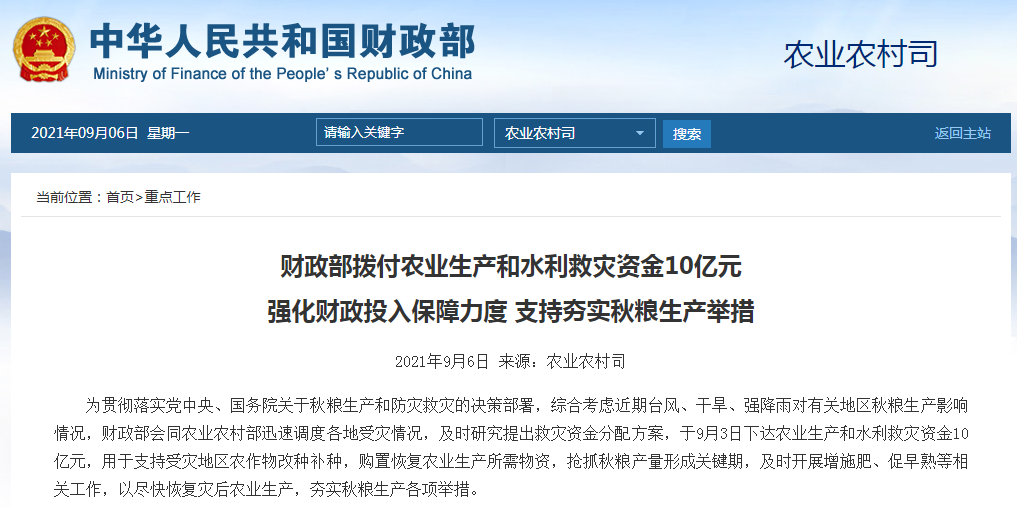 央视网消息:据国家财政部网站消息,为贯彻落实党中央、国务院关于秋粮生产和防灾救灾的决策部署,综合考虑近期台风、干旱、强降雨对有关地区秋粮生产影响情况,财政部会同农业农村部迅速调度各地受灾情况,及时研究提出救灾资金分配方案,于9月3日下达农业生产和水利救灾资金10亿元,用于支持受灾地区农作物改种补种,购置恢复农业生产所需物资,抢抓秋粮产量形成关键期,及时开展增施肥、促早熟等相关工作,以尽快恢复灾后农业生产,夯实秋粮生产各项举措。