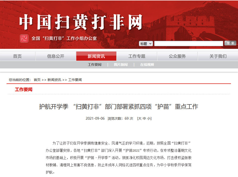 全国“扫黄打非”办公室负责人介绍,今秋开学季,“扫黄打非”部门将聚焦中小学生学习所使用的书籍材料及学习用品,常出入的校园周边文化经营场所,未成年人易接触、常使用的网站和应用等方面,落实“护苗”重点任务,认真抓好四项工作。