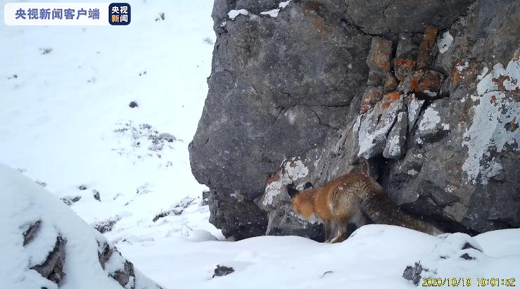从画面中可以看到,这只赤狐在雪地里嗅来嗅去,还用前爪在岩石和雪地间的缝隙掏了掏。巡护队员推测,这只赤狐冒着风雪也要出来的原因应该是为了找寻旱獭、鼠兔这些“美食”的踪迹。