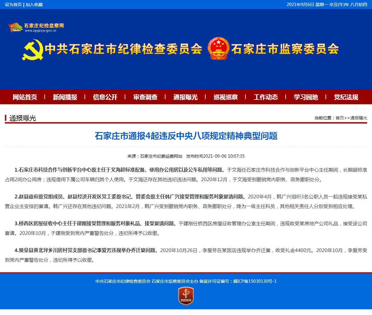 央视网消息(记者 徐辉):9月6日,石家庄市纪委监委网站发布消息,通报4起违反中央八项规定精神典型问题。