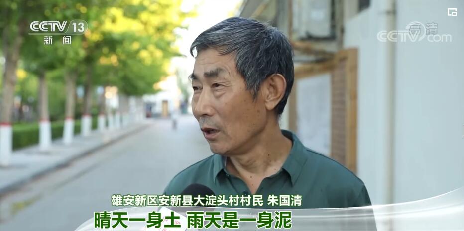 雄安新区安新县大淀头村村民 朱国清:过去常说“晴天一身土,雨天是一身泥”。过去这都是土地面,一下雨,你穿胶鞋都没半截。现在到处都是硬化了,绿化了,有车有房 我们饮水都是自来水 一拧都入了户了,非常方便,这真是到了小康社会。