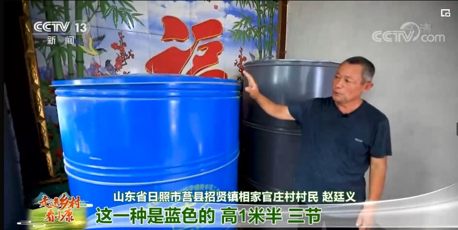 山东省日照市莒县招贤镇相家官庄村村民 赵廷义:我们农村流传着这么一句话就是“手里有粮 心里不慌” 这个粮囤有两种,一种是蓝色的,高1.5米,三节,每节50公分,直径有1.2米,装满能装2200斤粮食。这一种是灰色的,能装180—1900斤粮食。现在我们村储粮每户达5000多斤,家家户户储备粮食让我们有了底气。