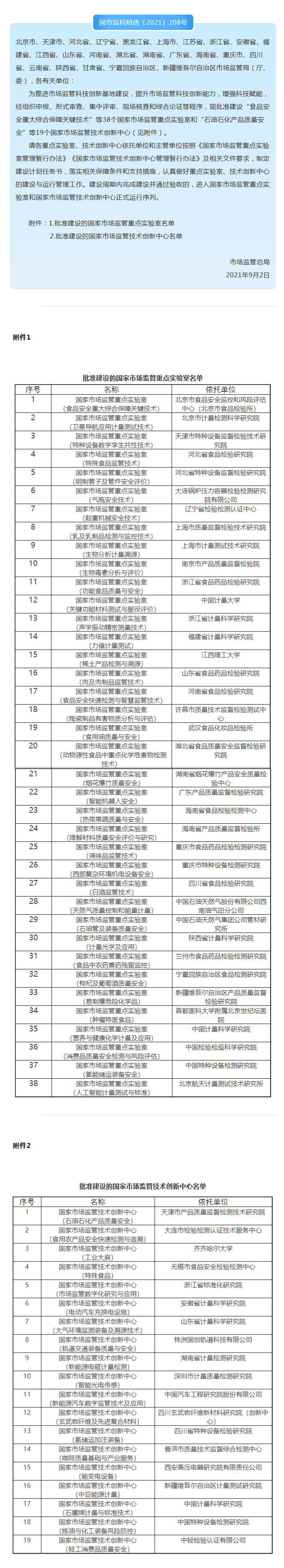 央视网消息:据“市说新语”微信公众号消息,为推进市场监管科技创新基地建设,提升市场监管科技创新能力,增强科技赋能,经组织申报、形式审查、集中评审、现场核查和综合论证等程序,现批准建设“食品安全重大综合保障关键技术”等38个国家市场监管重点实验室和“石油石化产品质量安全”等19个国家市场监管技术创新中心(见附件)。