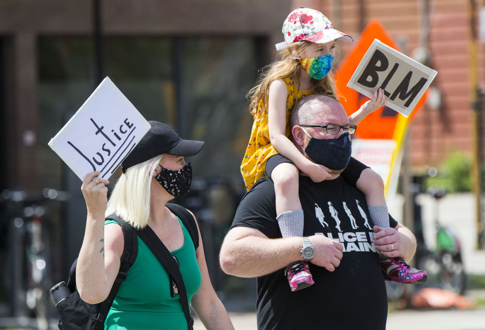 2020年6月6日,在加拿大多伦多,人们手持“正义”等标语参加反对种族歧视的示威活动。(新华社发,邹峥摄)